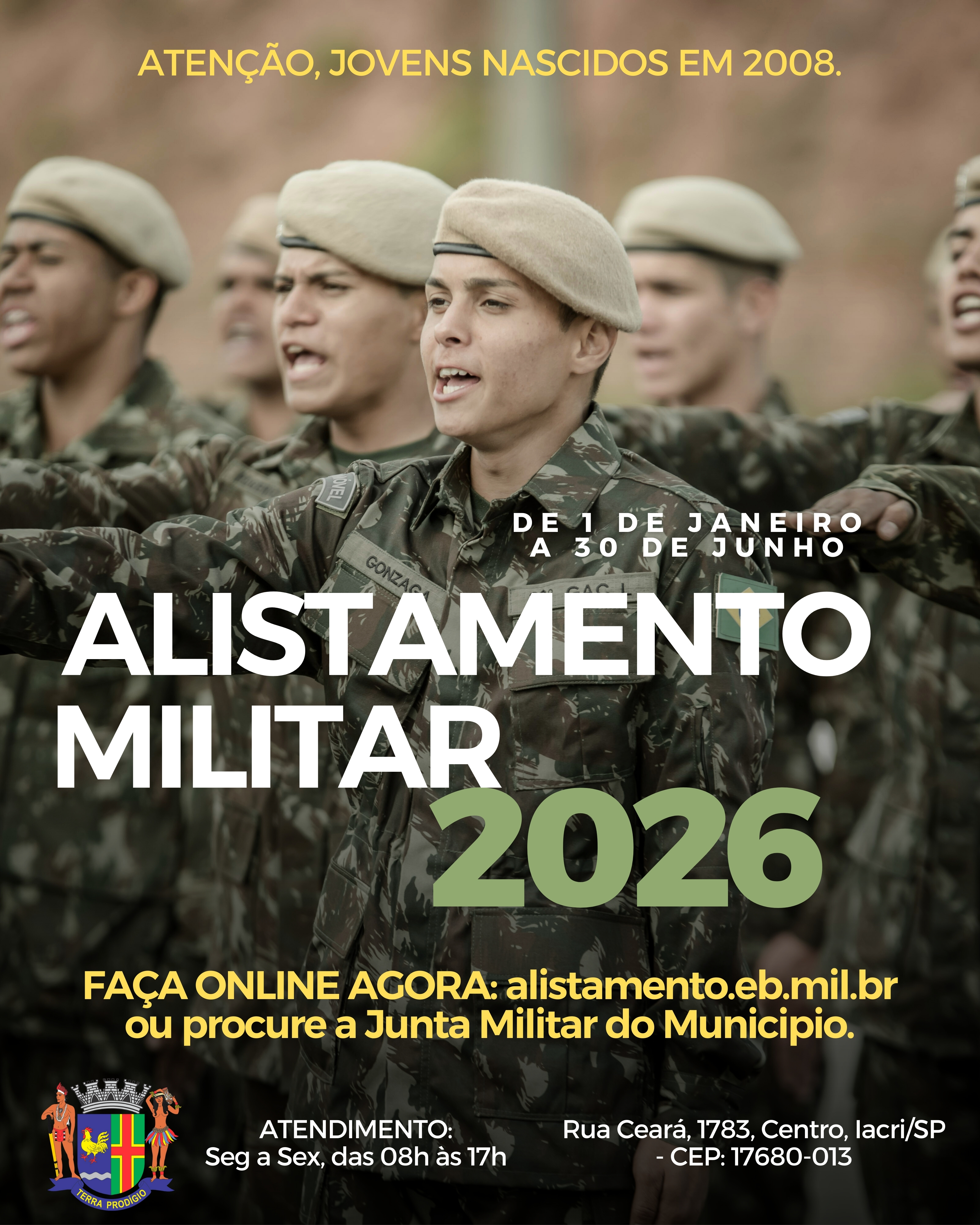 A Junta de Serviço Militar informa que está aberto o período de Alistamento Militar Obrigatório para os jovens do sexo masculino que completam 18 anos neste ano.