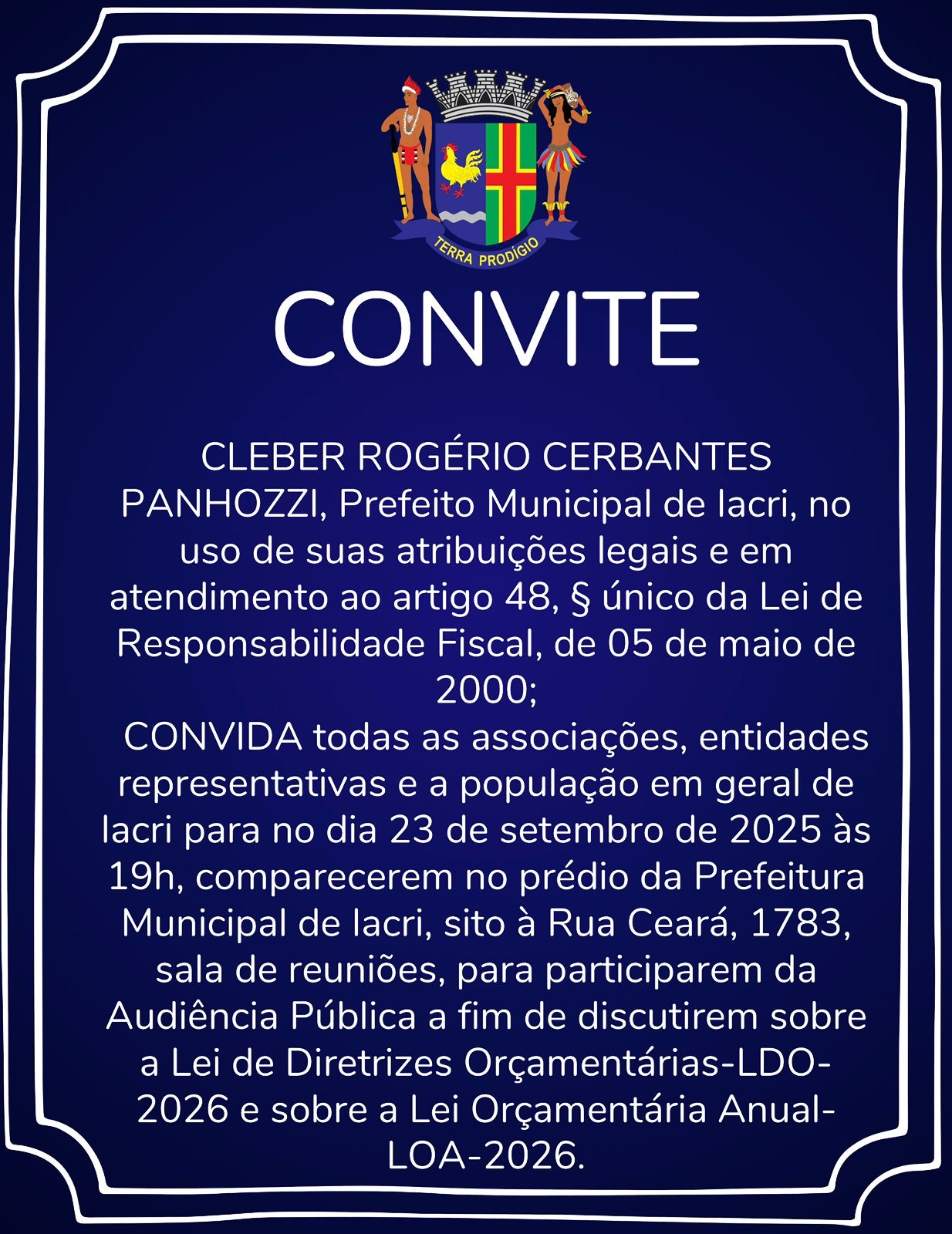 CONVIDA todas as associações, entidades representativas e a população em geral de Iacri para no dia 23 de setembro de 2025 às 19h, comparecerem no prédio da Prefeitura Municipal de Iacri, sito à Rua Ceará, 1783, sala de reuniões, para participarem da Audiência Pública a fim de discutirem sobre a Lei de Diretrizes Orçamentárias-LDO-2026 e sobre a Lei Orçamentária Anual-LOA-2026.