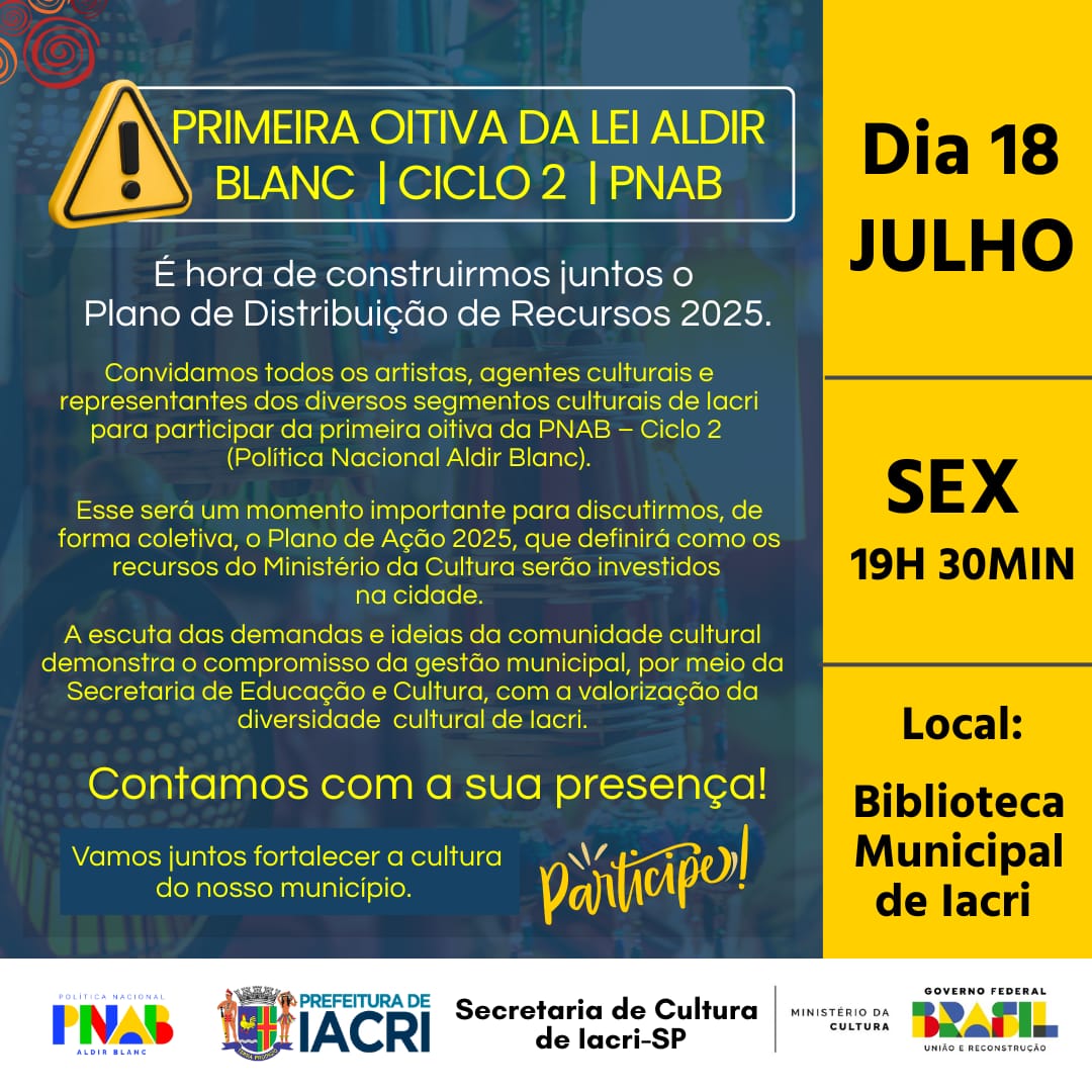 Convidamos todos os artistas, agentes culturais e representantes dos diversos segmentos culturais de Iacri para participar da primeira oitiva da PNAB – Ciclo 2 (Política Nacional Aldir Blanc).